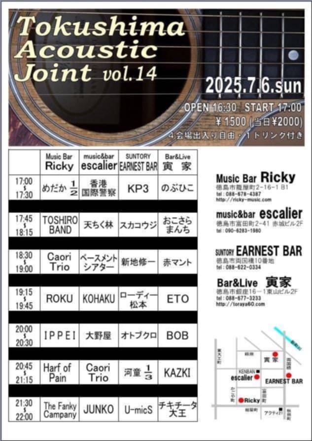 Tokushima Acoustic Joint vol.14 カテゴリ: 音楽 Tokushima Acoustic Joint vol.14 概要 日時 2025年 7月 6日 16:30 - 22:00 日付: 2025/07/06 4:30 PM – 10:00 PM カテゴリ: 音楽
