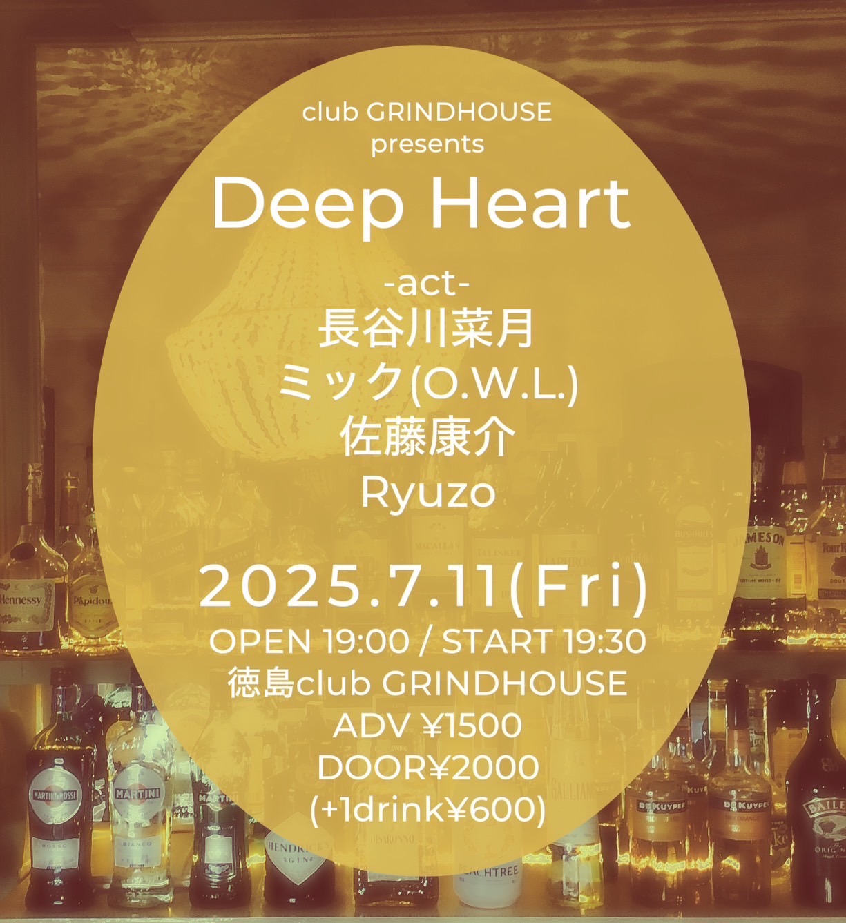club GRINDHOUSE 企画 Deep Heart カテゴリ: 音楽 club GRINDHOUSE 企画 Deep Heart 概要 チケット ADV ¥1500 / DOOR ¥2000 (+1D ¥600) 時間 19:00 / 19:30 出演 長谷川菜月 ミック(O.W.L.) 佐藤康介 Ryuzo お問い合わせ 徳島club GRINDHOUSE 日時 2025年 7月 11日 19:00 日付: 2025/07/11 7:00 PM 会場: club GRINDHOUSE カテゴリ: 音楽 地図 770-0934 徳島県徳島市秋田町2-23 ジョイフルビル3F club GRINDHOUSE