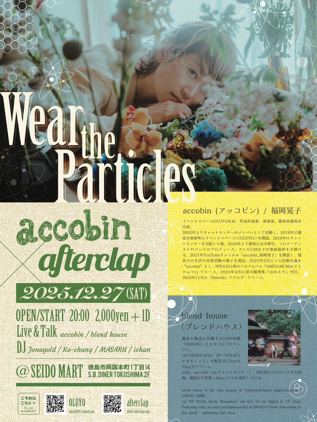 Wear the Particles – accobin x afterclap – カテゴリ: 音楽, DJ Wear the Particles – accobin x afterclap – 概要 LIVE&TALK 日時 2025年 12月 27日 20:00 日付: 2025/12/27 8:00 PM カテゴリ: 音楽, DJ 出演者 accobin(福岡晃子) blend house DJ Jonagold Ko-chang MASARU ichan チケット料金 2,000円+ドリンク代 会場 SEIDO MART 徳島県徳島市両国本町2-14-2F