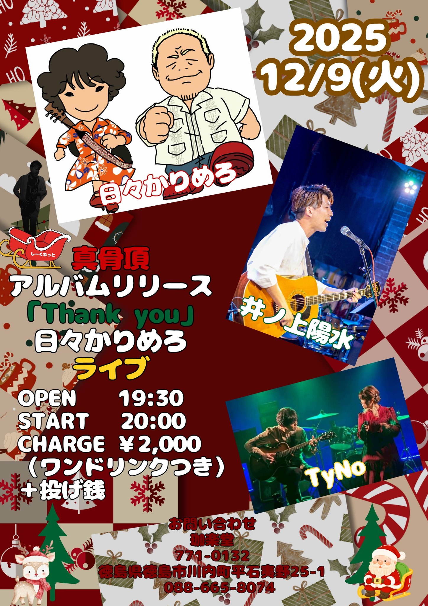 真骨頂アルバムリリース「Thank you」日々かりめろライブ カテゴリ: 音楽 真骨頂アルバムリリース「Thank you」日々かりめろライブ 概要 日時 2025年 12月 9日 20:00 日付: 2025/12/09 8:00 PM 会場: 珈楽堂 カテゴリ: 音楽 出演者 井ノ上陽水 TyNo 日々かりめろ 会場 珈楽堂 地図 771-0132 徳島県徳島市川内町平石夷野25−1 珈楽堂