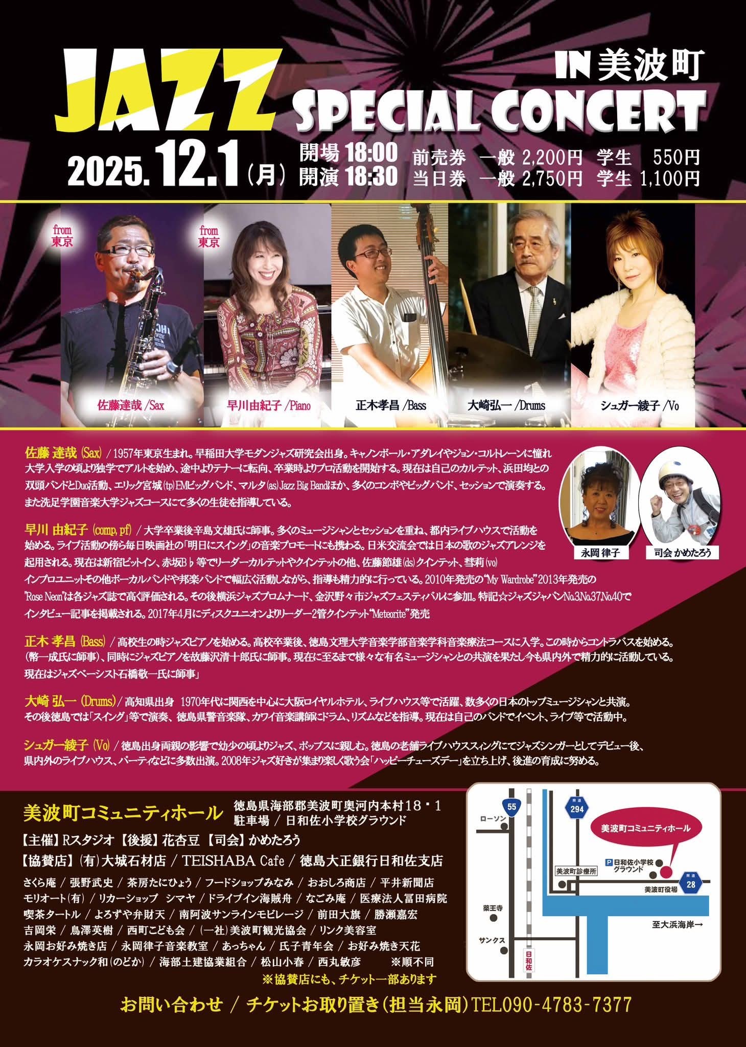 JAZZ SPECIAL CONCERT IN 美波町 カテゴリ: 音楽 JAZZ SPECIAL CONCERT IN 美波町 概要 日時 2025年 12月 1日 18:30 日付: 2025/12/01 6:30 PM カテゴリ: 音楽 会場 美波町コミュニティホール