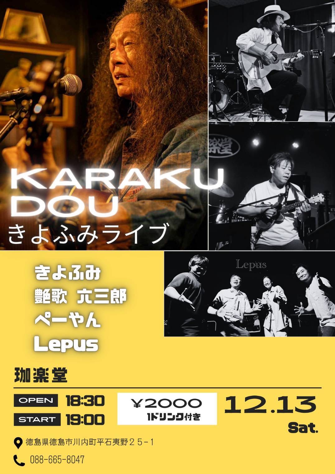 KARAKUDOUきよふみライブ カテゴリ: 音楽 KARAKUDOUきよふみライブ 概要 日時 2025年 12月 13日 19:00 日付: 2025/12/13 7:00 PM 会場: 珈楽堂 カテゴリ: 音楽 出演者 きよふみ大濱 Lepus 艶歌六三郎 ぺーやん チケット料金 料金¥2000 1ドリンク付き 会場 珈楽堂 地図 771-0132 徳島県徳島市川内町平石夷野25−1 珈楽堂