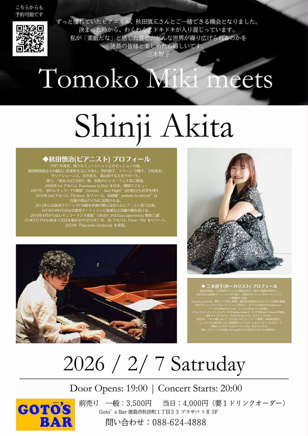 Tomoko Miki meets Shinji Akita カテゴリ: 音楽 Tomoko Miki meets Shinji Akita 概要 日時 2026年 2月 7日 20:00 日付: 2026/02/07 8:00 PM 会場: GOTO'S BAR カテゴリ: 音楽 会場 GOTO'S BAR 地図 770-0934 徳島県徳島市秋田町1-23 プラザパートⅡビル 5F GOTO'S BAR