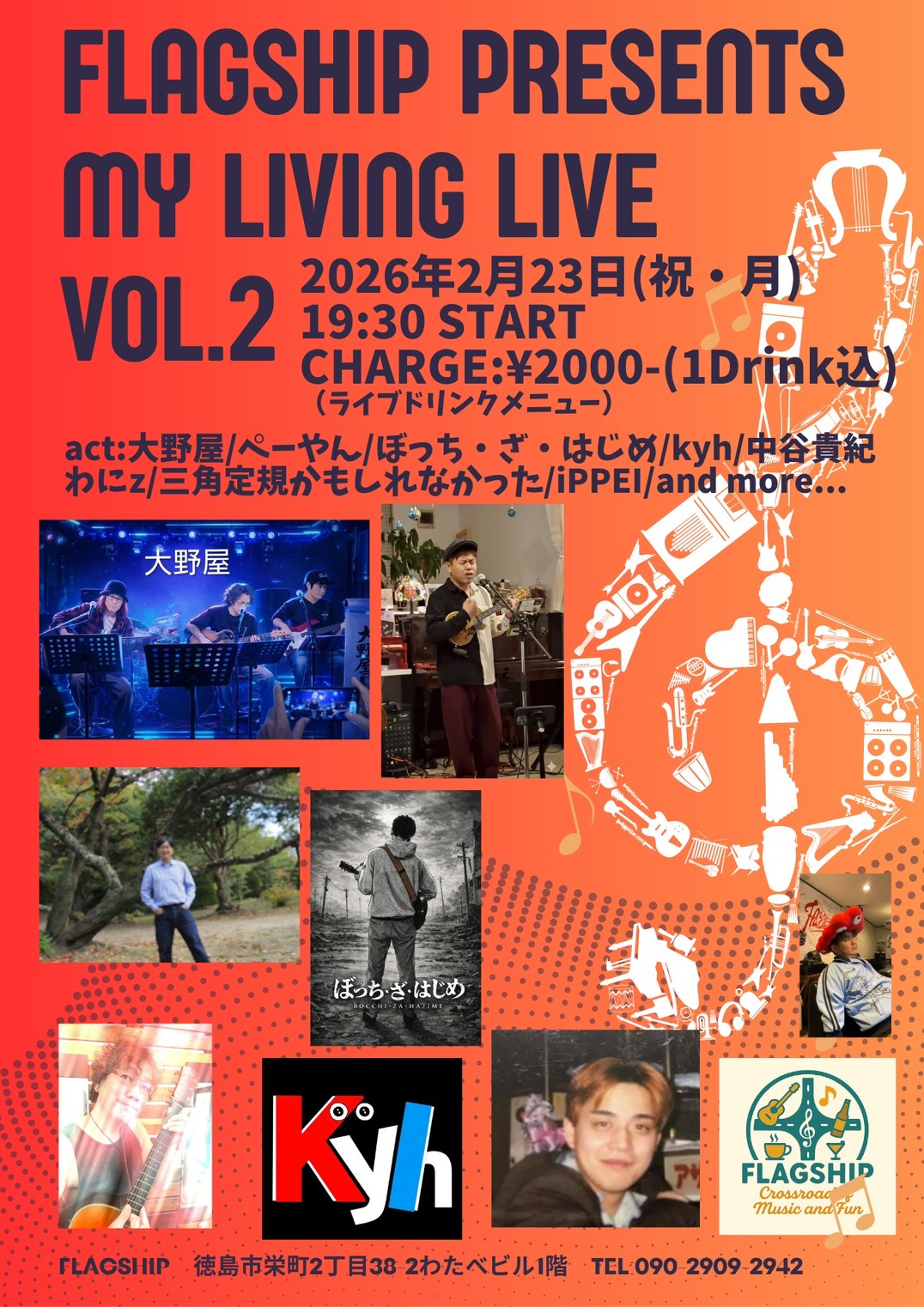 FLAGSHIP PRESENTS MY LIVING LIVE VOL.2 カテゴリ: 音楽 FLAGSHIP PRESENTS MY LIVING LIVE VOL.2 概要 日時 2026年 2月 23日 19:30 日付: 2026/02/23 7:30 PM 会場: FLAGSHIP カテゴリ: 音楽 会場 FLAGSHIP 地図 770-0921 徳島県徳島市栄町2丁目38-2 わたべビル1F FLAGSHIP