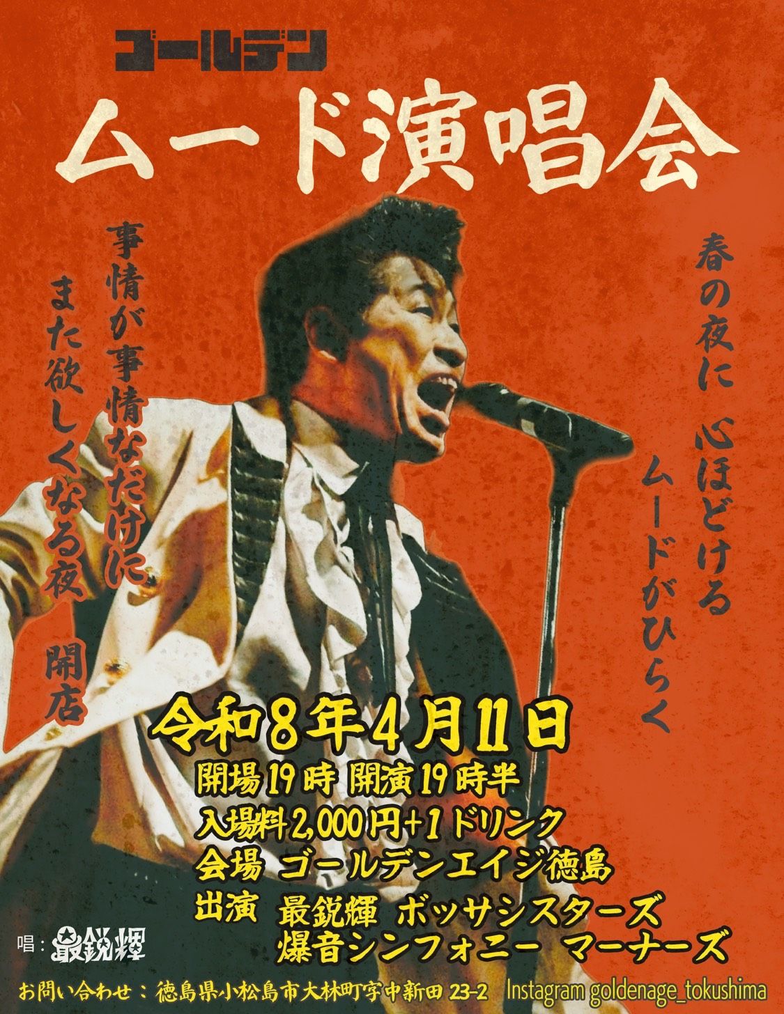 ムード演唱会 カテゴリ: 音楽 ムード演唱会 概要 日時 2026年 4月 11日 19:30 日付: 2026/04/11 7:30 PM 会場: GOLDEN AGE-徳島- カテゴリ: 音楽 地図 773-0022 徳島県小松島市大林町中新田23-2 久岡ビル 1F GOLDEN AGE-徳島-