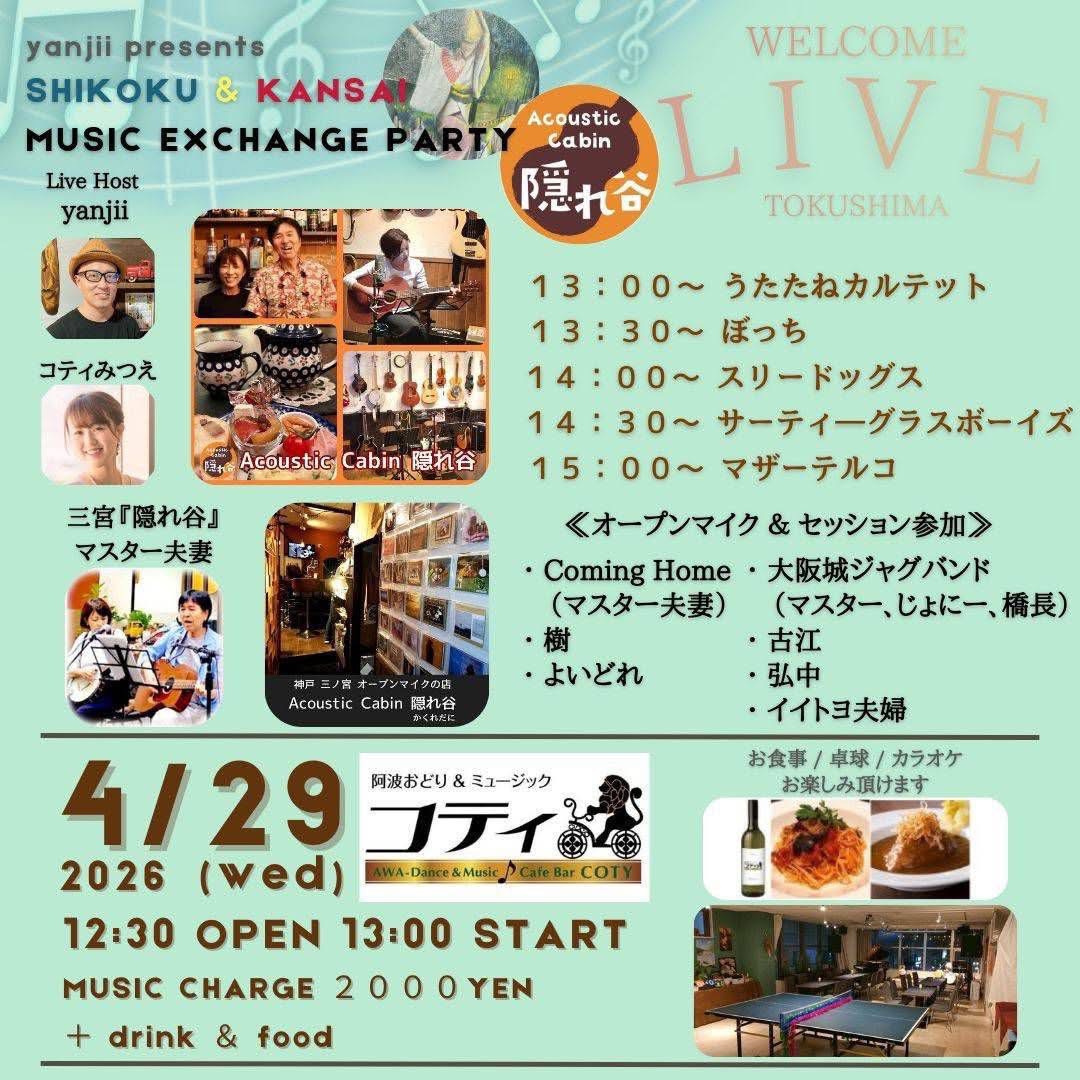 SHIKOKU & KANSAI MUSIC EXCHANGE PARTY カテゴリ: 音楽 SHIKOKU & KANSAI MUSIC EXCHANGE PARTY 概要 日時 2026年 4月 29日 13:00 日付: 2026/04/29 1:00 PM 会場: 阿波おどり&ミュージック コティ カテゴリ: 音楽 地図 770-0831 徳島県徳島市寺島本町西1-61-4 阿波けんどビル7F 阿波おどり&ミュージック コティ