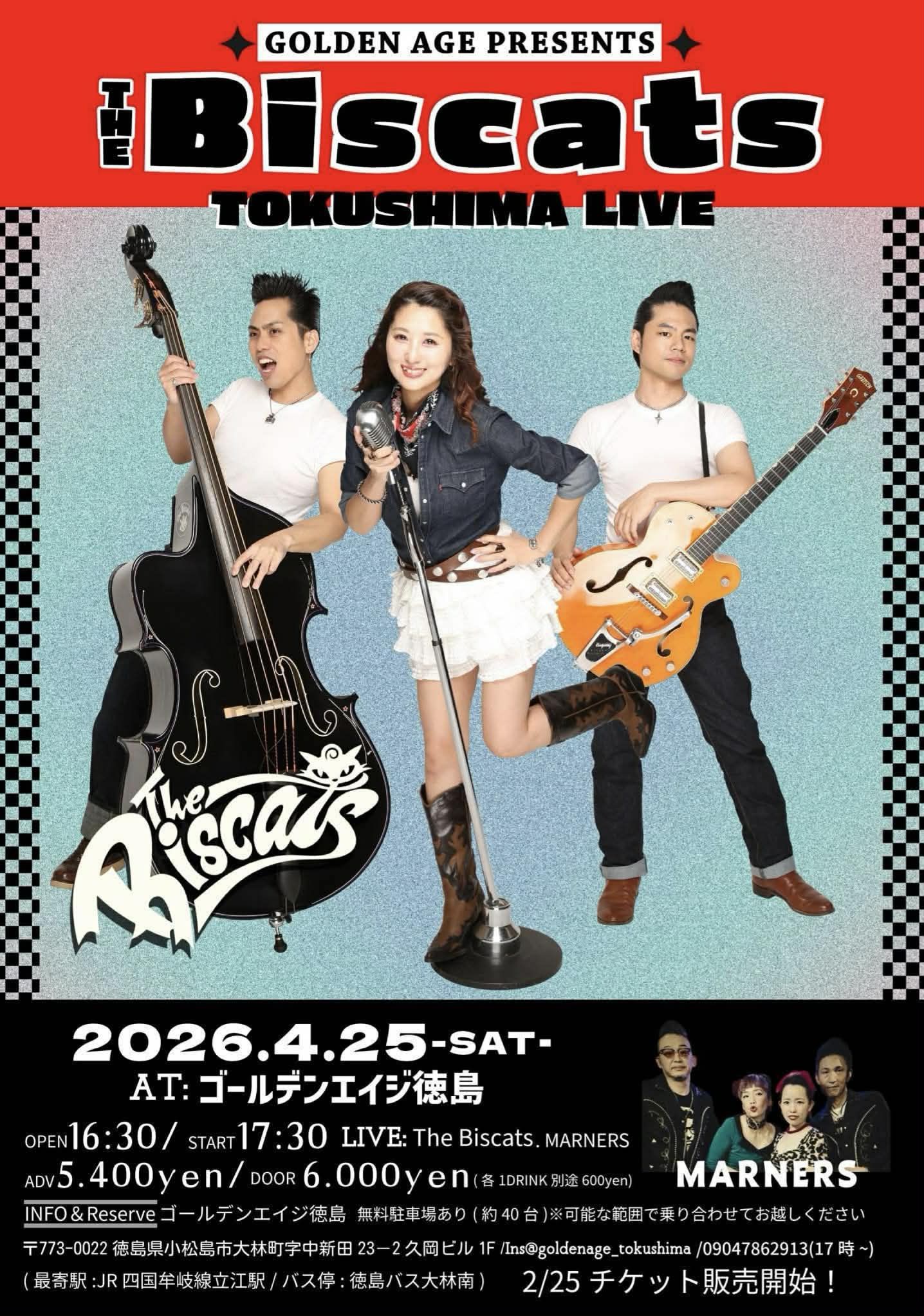 THE Biscats カテゴリ: 音楽 THE Biscats 概要 日時 2026年 4月 25日 17:30 日付: 2026/04/25 5:30 PM 会場: GOLDEN AGE-徳島- カテゴリ: 音楽 地図 773-0022 徳島県小松島市大林町中新田23-2 久岡ビル 1F GOLDEN AGE-徳島-